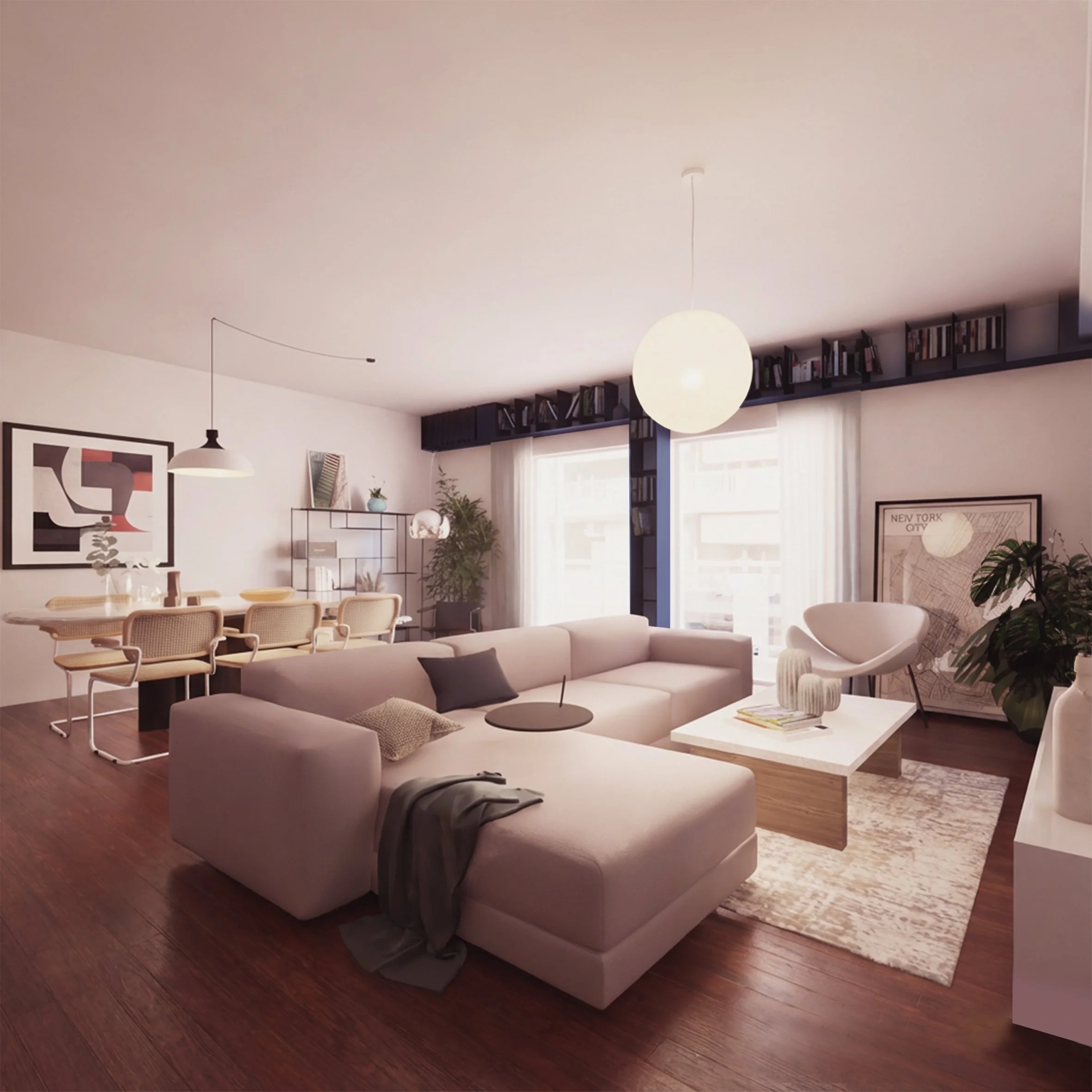 The living room, dining area, and kitchen are seamlessly connected, forming a continuous domestic landscape shaped by carefully proportioned built-in elements. Custom shelving and integrated storage establish a sense of order while allowing the space to remain open and adaptable. Warm wood flooring, soft neutral tones, and minimal detailing create a calm architectural language that emphasizes material consistency and tactile comfort.